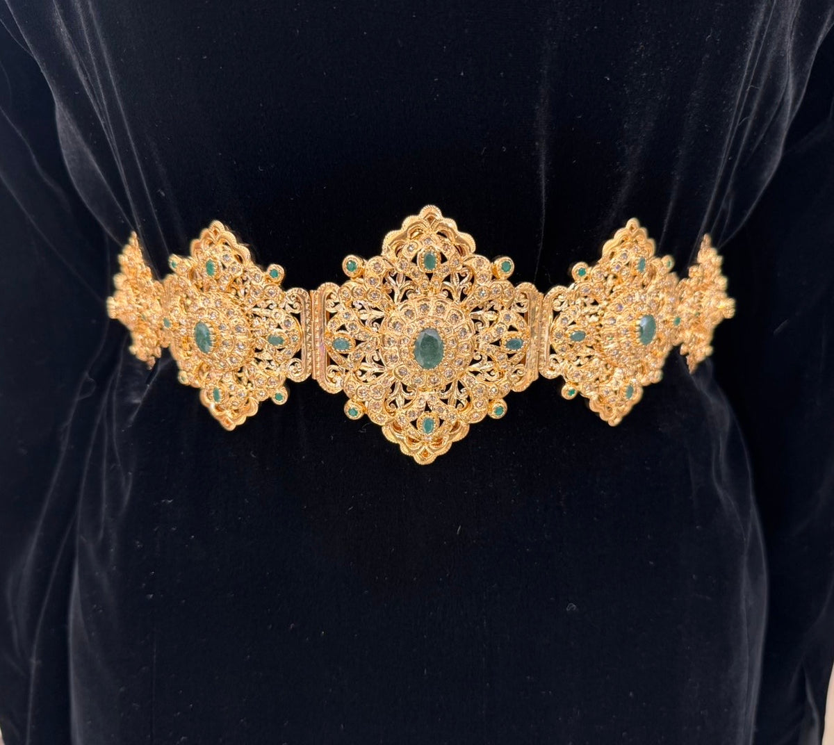 A statement belt crafted in silver dipped in gold, exquisitely detailed with ornate Moroccan-inspired motifs. Adorned with stones that can be fully customized to complement each caftan, this piece is designed to enhance the silhouette with regal elegance. Individually adjusted to the customer’s size, it offers both comfort and precision, making it the perfect finishing touch to complete the timeless Moroccan princess look.